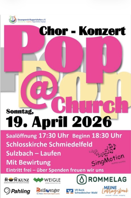 Auch in 2026 setzen wir unsere Chorkonzert-Reihe mit Chören aus den Nachbargemeinden fort. Wir freuen uns, zum ersten Mal die Gruppe „Sing Motion“ aus Ruppertshofen in der Schlosskirche begrüßen zu können. Das Konzert steht unter dem Motto: